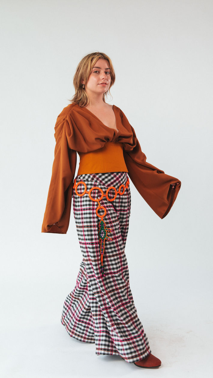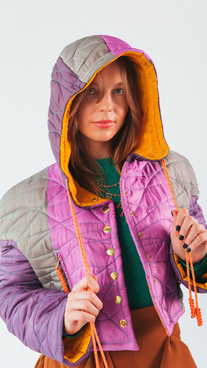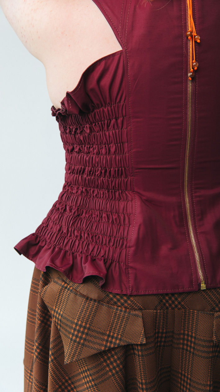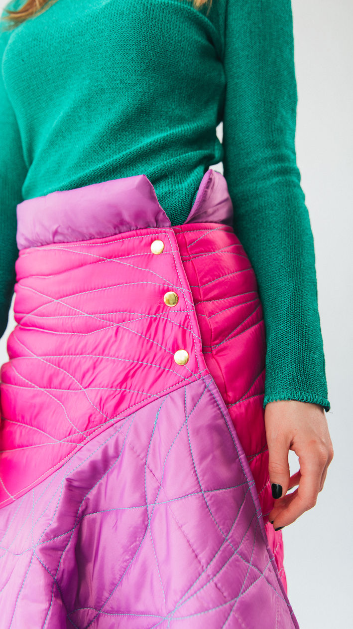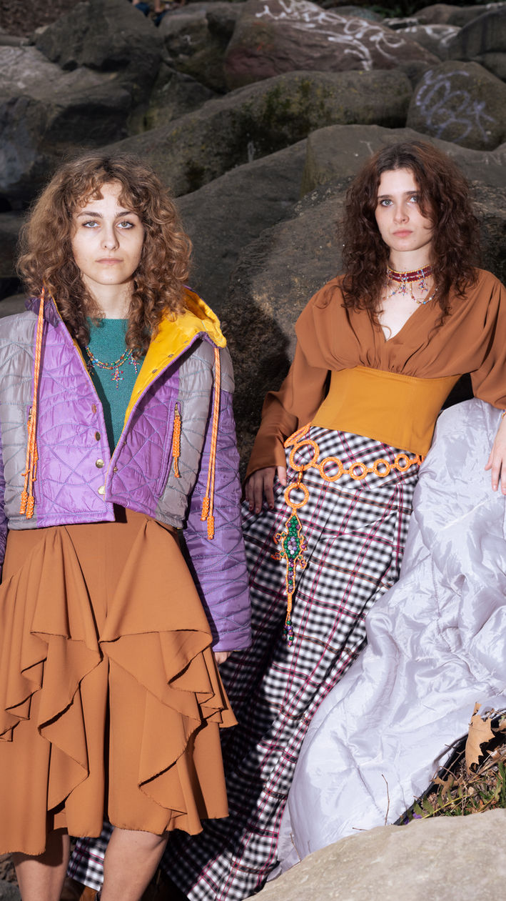 That Was In Tents explores summer camp and the structure of Girl Scouts as a microcosm of a potential society. This collection considers the materiality and physicality of camp through textile development and various traditionally feminine-coded handcrafts. The use of upcycled sleeping bags parallels the practice of queer reclamation. That Was In Tents also explores knot-tying, beading, friendship bracelets, and knitting as camp crafts which can generate fully fashioned garments and accessories when removed from their traditional pedagogies. This collection investigates historical Girl Scout uniforms and outdoor gear as examples of the desirable body in the time which generated them; relating these silhouettes to life today by reappropriating the frame of earlier uniforms, rendering them in technical fabrics with elasticated paneling, sculpted pleating, and drapery.